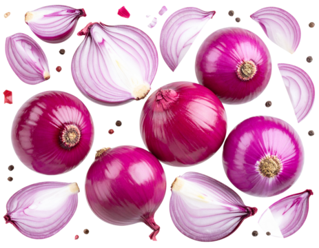 Assortment of whole sliced and ringed fresh red onions tumbling dynamically in a vibrant culinary composition vegetable rings food ingredient purple produce bulb root vegetable transparent background