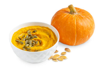 Homemade creamy healthy vegetarian pumpkin soup made of pureed vegetables of orange colour decorated with dried peeled seeds served in bowl isolated on white background with vegetable ingredient