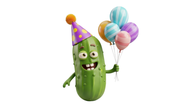 Happy Green Pickle Cartoon Character with Birthday Hat and Balloons isolated PNG with Transparent Background