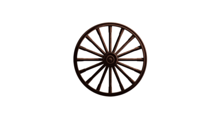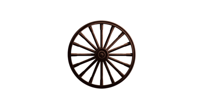 Vintage wooden wheel design, displaying intricate spokes against a white isolate background.