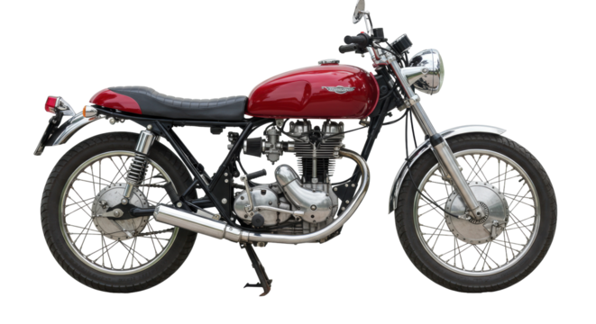 Classic red motorcycle isolated on a clean backdrop, vintage motorbike with chrome accents and detailed engine components