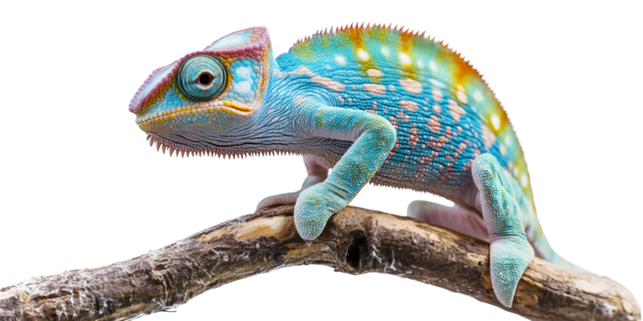 Vibrant veiled chameleon perched on a branch showing off its beautiful colors isolated on transparent background