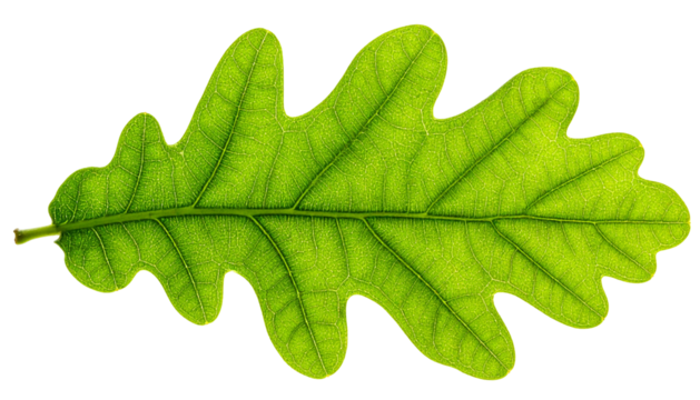 A single, bright green oak leaf with distinct veins, isolated on a black background