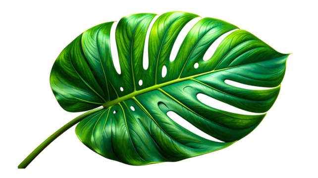 Isolated, glossy Monstera deliciosa leaf, detailed with veins and holes, against black