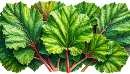 Lush cluster of vibrant green rhubarb leaves with red stalks