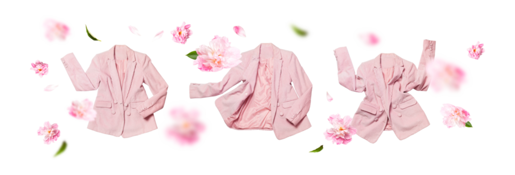 Creative Spring clothing mockup. Womens fashionable flying pink blazer and delicate flowers peonies isolated on white background. With clipping path. Female fashion, Sale, springtime discounts