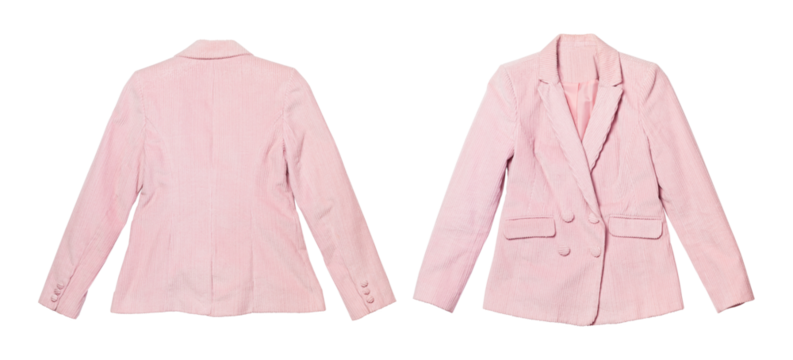 Spring clothes mockup. Womens pink blazer isolated on white background. With clipping path. Female fashion, clothing, stylish fabric cotton blazer. Collection of cut out Corduroy jacket
