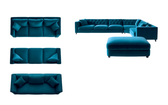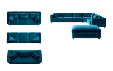 Set of azure velveteen furniture made of different materials. sofas - top view and front view. isolated on transparent background