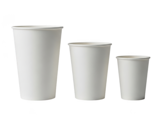 Three white paper cups different sizes mockup disposable coffee cup tea cup drink cup vending cup isolated on transparent background