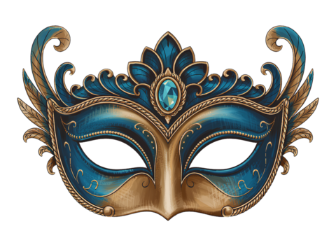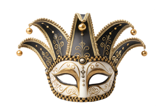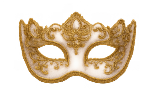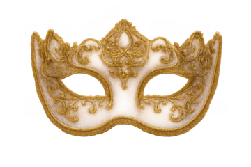 Ornate venetian masquerade mask celebrating carnival and mystery in gold and white on transparent background
