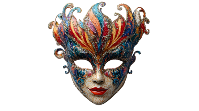 Vibrant colorful carnival mask with ornate details, isolated on a transparent background