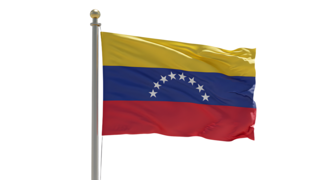 Venezuelan national flag waving on a silver flagpole against white background, symbol of Venezuela and patriotism