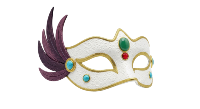 A vibrant, ornate venetian masquerade mask with intricate details and colorful embellishments, isolated on transparent background