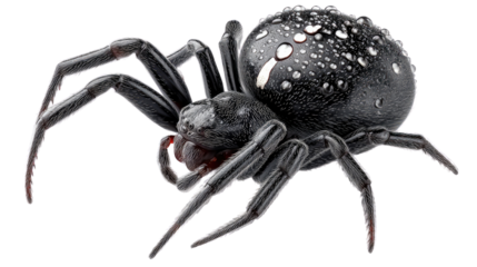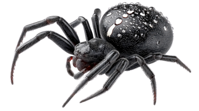 Black Widow Spider with Dew Drops: A macro shot captures the intricate detail of a venomous black widow spider adorned with shimmering dew drops.
