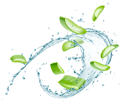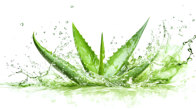 Aloe vera plant, vibrant green leaves, water splash, transparent liquid, white background
