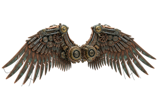 large, photorealistic steampunk wings of verdigris copper and aged brass, showing intricate gears and pistons, isolated on a high-contrast white studio background. concept of victorian engineering