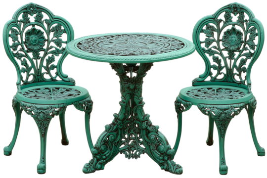 Green wrought iron ornate garden patio set isolated transparent background vintage antique bistro furniture teal table chairs, cut out.