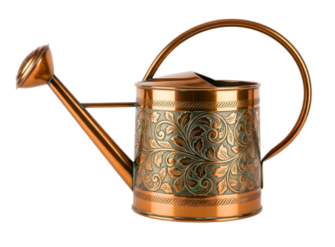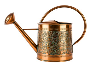 A vintage copper watering can with beautiful verdigris and engraved details isolated on transparent background
