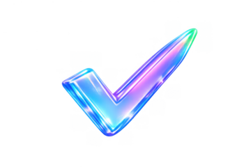 3d holographic checkmark icon reflecting iridescent neon light confirming success and completion on transparent background