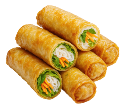 A delicious pile of crispy fried Vietnamese spring rolls filled with fresh vegetables and vermicelli noodles, Isolated on Transparent and White Background