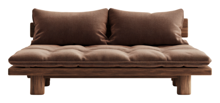 Brown upholstered wooden sofa with twin cushions on a transparent background