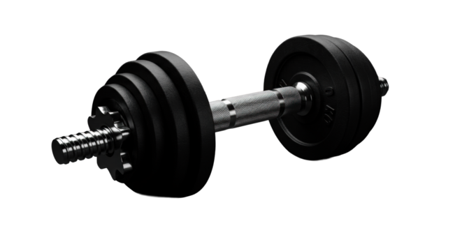 Modern adjustable dumbbell with black cast iron plates, chrome knurled grip on dark high-end surface, studio product shot, concept of efficient versatile strength training