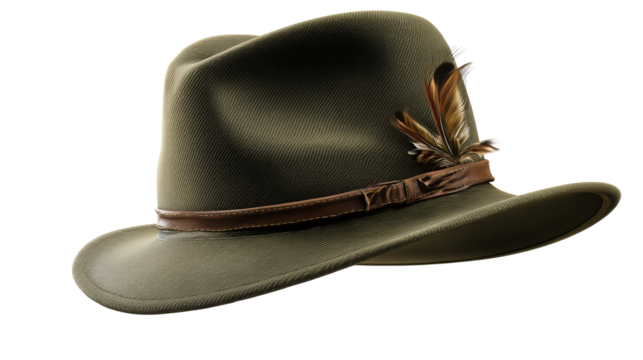 Stylish floating brown fedora hat with blue gray ribbon on transparent background