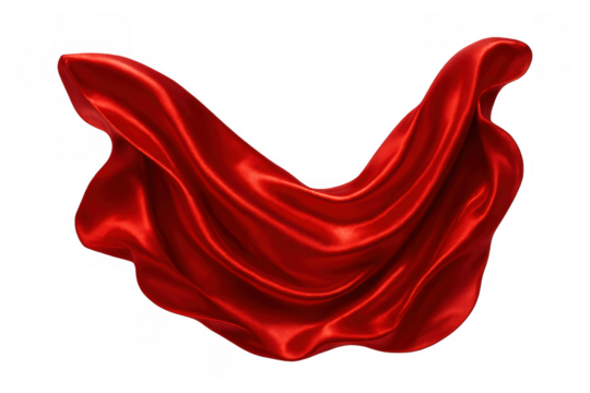 Red silk fabric flowing, creating soft waves and folds. Transparent background offering versatility for design projects