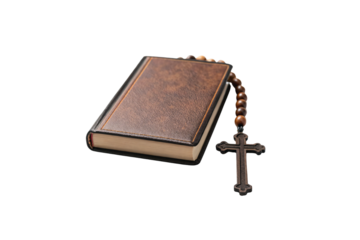 Brown leather-bound book with wooden rosary beads featuring ornate cross pendant resting beside it, isolated on a transparent background
