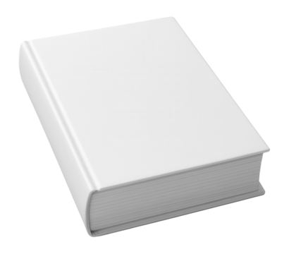 Closed plain white hardcover book with visible spine and pages on transparent background.