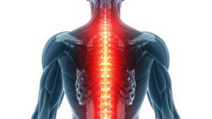 Human spine pain concept with glowing red back view isolated on transparent background