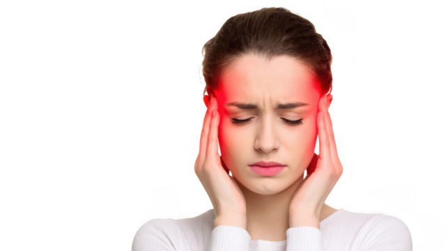 Transparent x ray view depicting a human skeleton holding its head, experiencing severe headache and neck pain, with affected areas highlighted in vivid red for emphasis