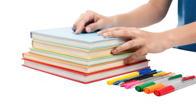 Five new, uniform hardcover books stacked vertically with blue, red, yellow, green, and brown spines, perfectly lit on a transparent background, shadowless product photography concept