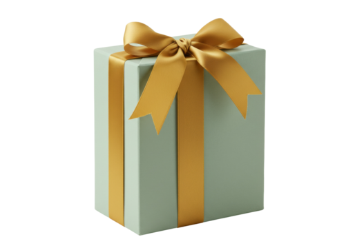 Elegant light green gift box with golden ribbon isolated, present for special occasions and celebrations
