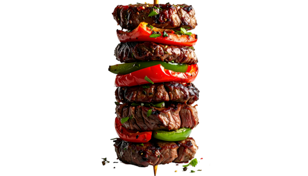 A stack of grilled steak and colorful bell peppers on a skewer, against a dark backdrop