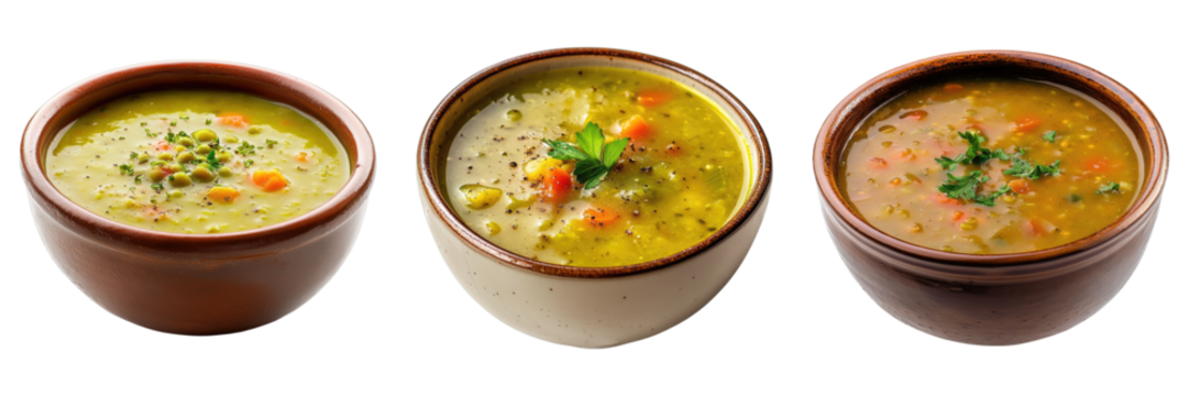 Set of bowl of freshly made split pea soup isolated on transparent, PNG