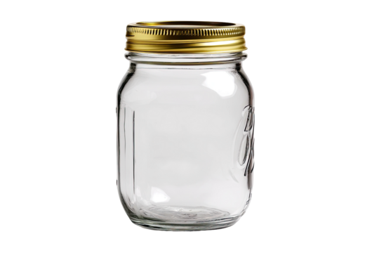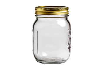 Empty glass container with golden lid, transparent, on black background, storage