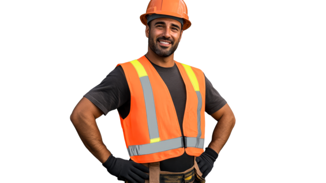 Worker wearing an orange hard hat and safety vest against transparent background
