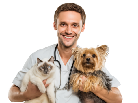 Transparent background: vet holding adorable yorkshire terrier puppy