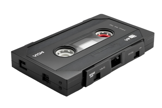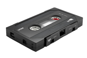 Isolated VHS video cassette tape, a retro black plastic object for old movie technology and media record on a white background
