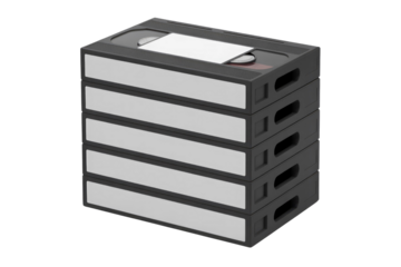 A stack of five blank black VHS video cassette tapes, with white labels, on a transparent background, evoking retro media storage. background removed