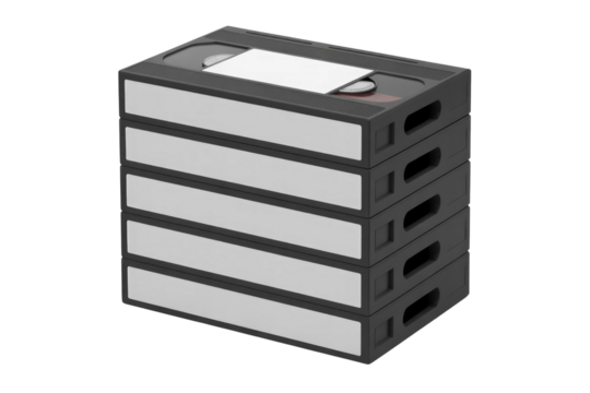 A stack of vintage VHS video tapes with blank labels, isolated on a white background, showcasing retro technology for recording and watching movies at home.