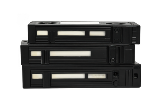 A stack of vintage VHS tapes on a transparent background