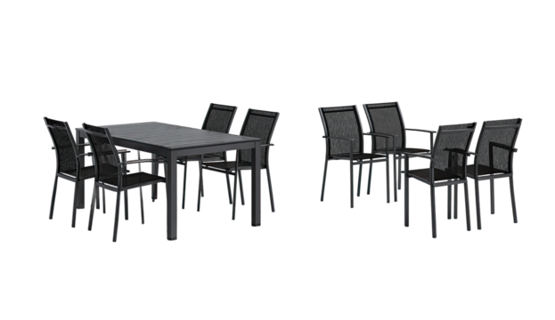 Gray outdoor dining set.  A rectangular table and six chairs.  Dark gray metal frames.  Mesh backs and seats.  Computer-generated image