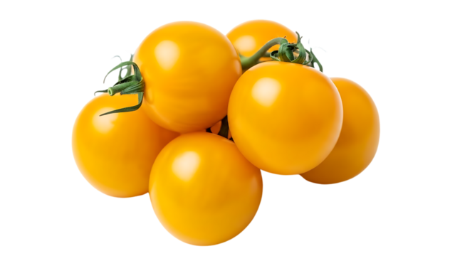Cluster of Six Bright Yellow Lemons with Fresh Green Stems and Leaves isolated on a transparent background