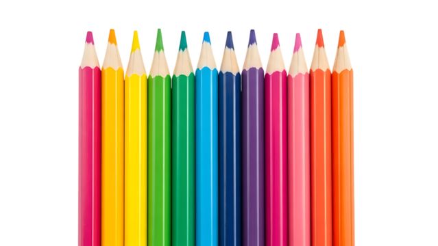 colorful pen and set of colored pencils arranged on isolated transparent background showcasing vibrant hues and various sizes of drawing instruments