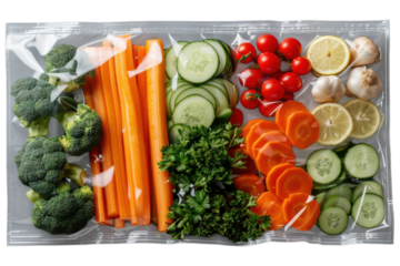 Fresh vegetables including broccoli carrots cucumbers tomatoes lemons and garlic in a plastic bag ready to eat on transparent background