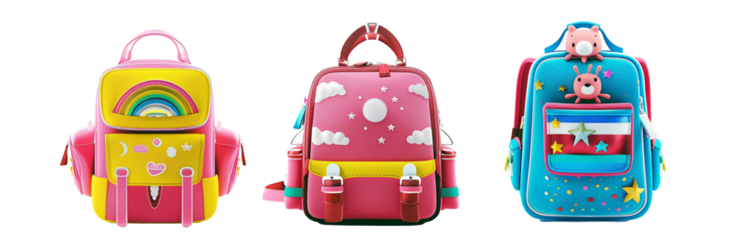 set of different classic school bags for elementary students, with cartoon characters and bright colors, isolated on transparent background
