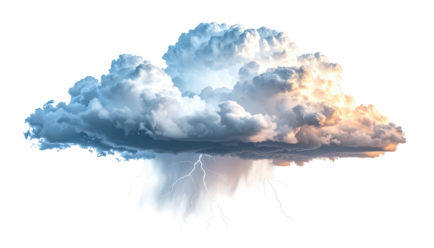 Isolated, dramatic cumulonimbus cloud with bright lightning strikes against a black backdrop