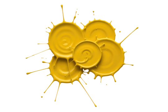 Three yellow paint splashes on a transparent background, creating a dynamic and vibrant composition. background removed